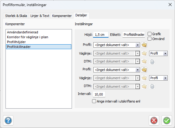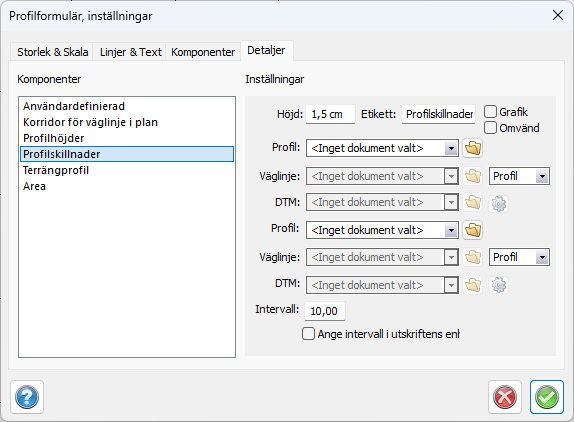 Kommandot jämför höjderna mellan två profiler, mellan profil och terrängprofil eller mellan två terrängprofiler. Höjden kan anges i enhet eller visas grafiskt. I övrigt är det samma inställningar som i övriga detaljer, det vill säga höjd på raden och rubrik på raden kan sättas separat.