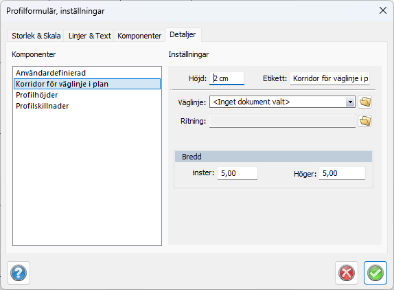 Verktygsboxen för vägprofilen är vital för redigering och inmatning av vägprofil. I denna visas: