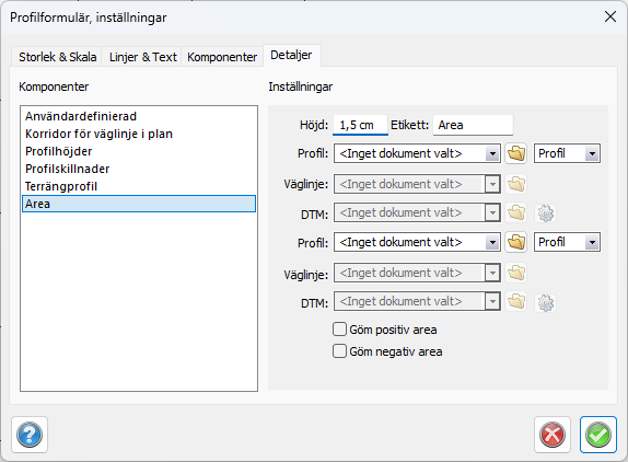 Areakomponenten är en komponent till Profilformuläret för beräkning av areor mellan profiler.