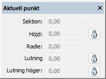 Radie. Dialogen för vald punkt i profilformuläret låter användaren specificera punktens placering samt om en radie skall användas. Om fältet för radie lämnas blankt används ingen radie. Fälten för vänster och höger lutning visar lutningen på punktens angränsande linjer. Det är möjligt att låsa både höjden och lutningen. Programmet tillåter inte radier på punkter som ligger mellan två linjer med samma lutning.