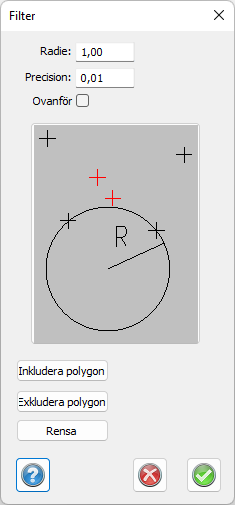 Det går även att välja områden som antingen inte ska eller bara ska beräknas med filtret. Exkludera respektive Inkludera områden. Du ritar helt enkelt en polygon där du vill att punktmolnet ska filtreras. Detta är användbart för till exempel vägar med kanter, kantsten, etc där man inte vill sudda bort konturerna av kantstenen,idet fallet kan man exkludera dessa områden för filtrering.