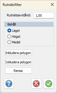 Det går även att välja områden som antingen inte ska eller bara ska beräknas med filtret. Exkludera respektive Inkludera områden. Du ritar helt enkelt en polygon där du vill att punktmolnet ska filtreras. Detta är användbart för till exempel vägar med kanter, kantsten, etc där man inte vill sudda bort konturerna av kantstenen,idet fallet kan man exkludera dessa områden för filtrering.