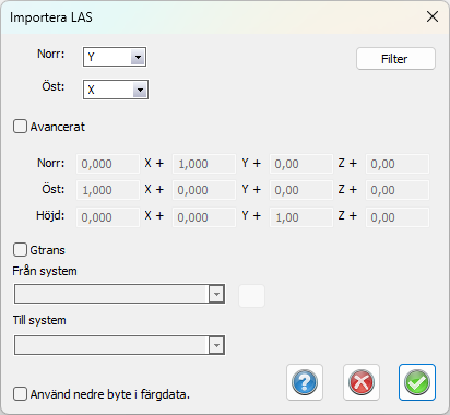 Om inte färgerna ser bra ut när du importerar din LAS-fil så finns ett alternativt sätt att hämta färger genom att klicka i Använd nedre byte i färgdata.