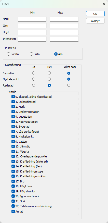 Filtrera vilka punkter som ska importeras. Klicka på Filter och följaden dialog öppnas.