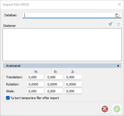 Ny dialog öppnas. Välj Viva databas. Under Avancerade inställningar kan man ta bort temporära filer i den temporära katalogen, och ställa in translation, rotation och skala.
