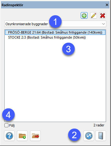 Fönstret Radinspektör visar en lista av alla objekt i ett lager. Texten i listan kommer från ett av lagrets attribut.