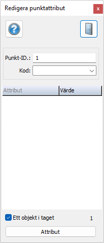 Notera att attributen ändras om du ändrar koden. Attributen är normalt sorterade under punktkod eller direkt på symbol. Attribut kan även vara objektattribut och kan då endast redigeras från detta kommando alternativt från det attributredigeringskommando som tillhör respektive databas.