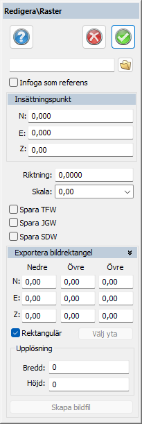 Klicka i om georefdata ska sparas till TFW, JGW och SDW filer. Georefdatan sparas samtidigt som ritningen sparas och har samma filnamn som rasterbilden så när som på filändelsen. Om georefdatan sparas för en viss rasterbild så innebär det att rasterbilden kommer få samma position om den sätts in i en annan ritning.