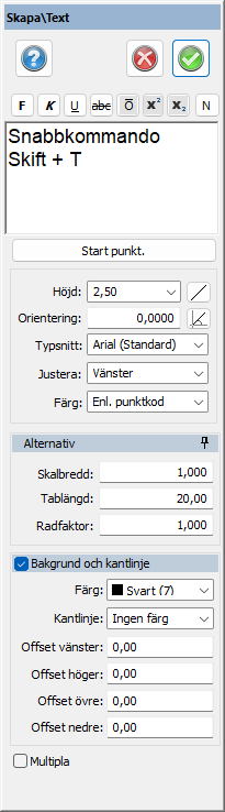 Text kan ha en bakgrundsfärg och färg på kantlinje. Bakgrunden anges när texten skapas och kan ändras i efterhand genom att ändra egenskaperna för texten eller genom att använda kommandot redigera text.