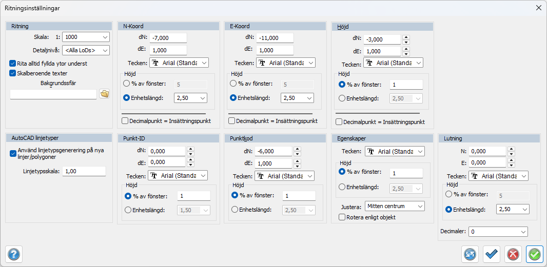 Inställningar som finns under systeminställningar gäller för nya ritningar som skapas, befintliga ritningar behåller sina ritningsinställningar. Så dessa inställningar under Ritningsinställningar gäller för aktiv ritning.