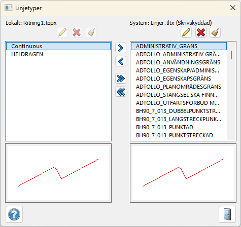 Under de lokala/globala linjetyperna kan du placera linjetyper från ritningen till den globala filen eller vice versa. Den globala linjetypsfilen är den fil som är vald under Hem|System|Systemfiler och har ändelsen .TLTX, till exempel Linjer.tltx.