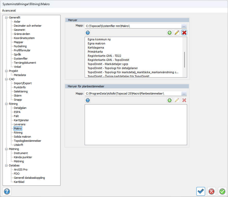 Det finns två olika makromenyer, en för CAD-ritning och en för planbestämmelser. De har olika anrop i Topocads ritning.