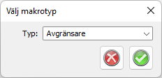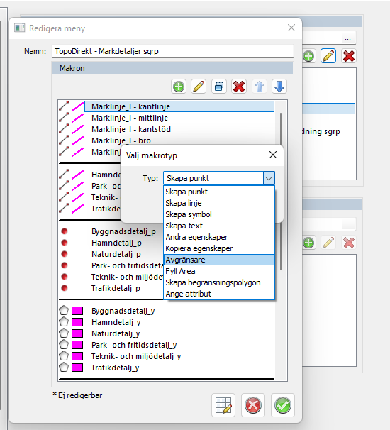 Välj vilken typ av makro som ska skapas. De som finns att välja på är skapa punkt, linje, symbol, text, ändra egenskaper, kopiera egenskaper, avgränsare, fyll area samt skapa begränsningspolygon.