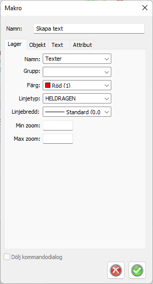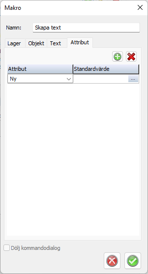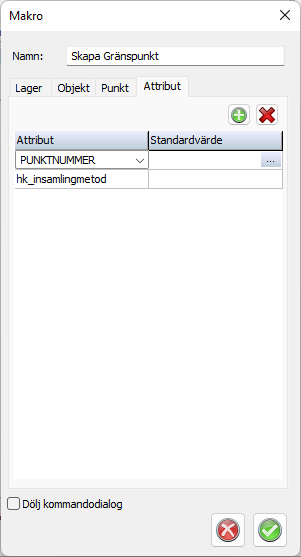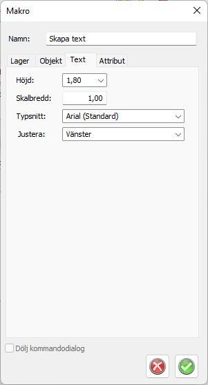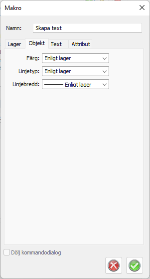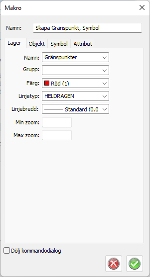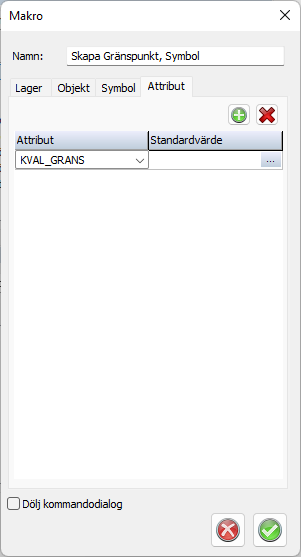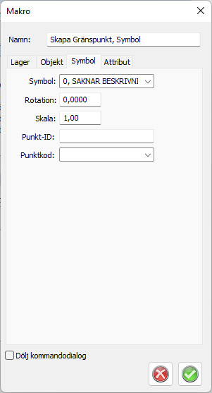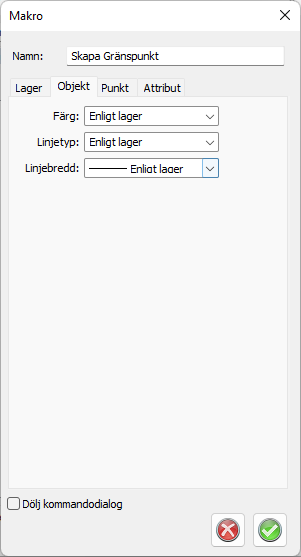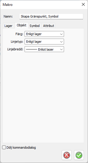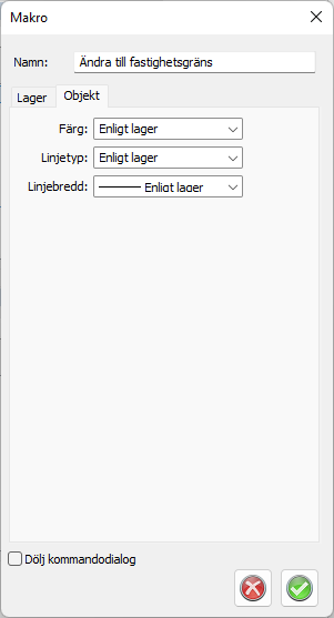 Dölj kommandodialog: Om denna bockas för så kommer kommandodialogen inte visas när makrot körs, dialogen kan dock aktiveras i makrot med snabbkommandot Q.
