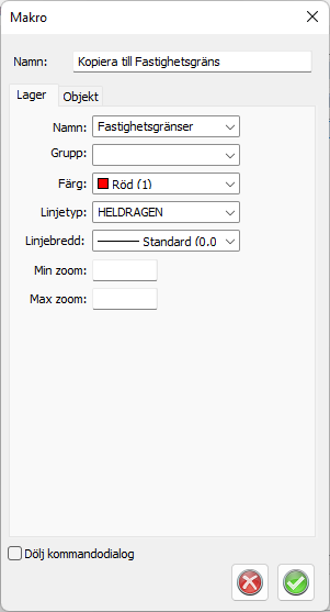 Ange vilket namn makrot ska ha, t ex Kopiera till fastighetsgräns. Detta makro använder kommandot Skapa Kopiera.