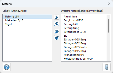 Materiallista liknar lokala och globala listor för symboler och linjetyper. Material som används i ritningen hamnar i den lokala listan och vill man uppdatera den globala listan behöver man lägga över material från lokalt till globalt.