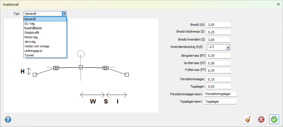 Under Typ i rullistan kan du välja snabbmall för generell väg, väg med gång- och cykelväg, väg med busshållsplats, stadstrafik, motorväg, järnväg, VA-dike, ledningsgrav och tunnel.