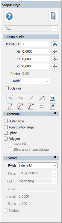 Rita en linje gör du genom att aktivera kommandot Skapa linje. Det går bra att rita direkt på skärmen eller knappa in koordinater eller en kombination av dessa. Du kan direkt på skärmen rita linjen och varje punkt ges en koordinat då du klickar på vänster musknapp. Om du matar in koordinater i dialogen går du till nästa punkt genom att trycka Enter eller på Lägg till punkt. När hela linjen har ritats trycker du på Klar (snabbkommando F2). Det går även bra att skriva in beräkningar i koordinatinmatningen, exempelvis +100 eller -50 så beräknas den nya koordinaten. Du kan även välja Abs (Absoluta) Rel (Relativa) och Pol (Polära, vinkel och längd) för att ange denna typer av mått.