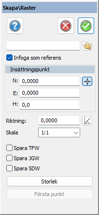 Klicka i om georefdata ska sparas till TFW, JGW och SDW filer. Georefdatan sparas samtidigt som ritningen sparas och har samma filnamn som rasterbilden så när som på filändelsen. Om georefdatan sparas för en viss rasterbild så innebär det att rasterbilden kommer få samma position om den sätts in i en annan ritning eller en terrängmodell/punktmoln.