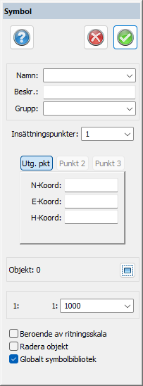 Ange hur många insättningspunkter symbolen har. Standard är en. Om två eller tre insättningspunkter finns ska man vid insättning eller inmätning med symbol ange att symbolen ska variera i storlek och riktning efter den storlek som man anger eller mäter in.