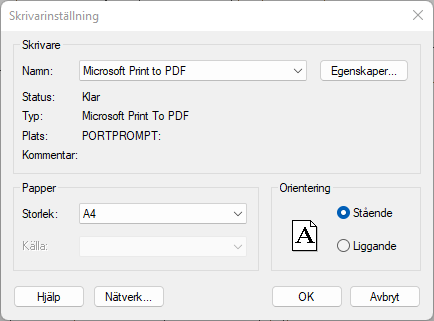 - Du får nu upp en dialog där du kan välja på samtliga installerade skrivare eller plottrar. Välj den önskade skrivaren.