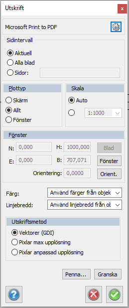 Fönster: Du väljer ut det fönster du vill plotta ut. Du kan antingen skriva in koordinaterna och fönstrets storlek eller peka ut det. Peka då på rutan Fönster och peka sedan i tur och ordning - nedre vänstra hörn, riktningen (längs med vänstra sidan) och övre högra hörn. Resultatet kan justeras i dialogen. Om riktningen är rakt upp kan du "hoppa över" riktningen genom att klicka höger musknapp och direkt ange storlek efter att du pekat ut det nedre vänstra hörnet. Storleken pekar du då ut till det övre högra hörnet.