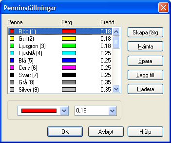 Penninställningarna kan anges under Inställningar|System|Ritning - standardpenntabell eller anges här i denna dialog. För varje specificerad färg i ritningen kan du ange färg och bredd på utskriften. Inställningarna kan sparas.