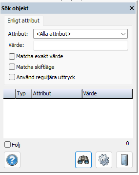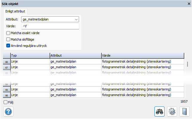 Resultaten visas i listan under rubrikerna Typ, Attribut och Värde. Antalet träffar hamnar nere till höger.