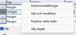 Högerklick i listan visar en meny där ett antal val kan göras. Härifrån kan du välja objekt och på så vis selektera de i kartan.