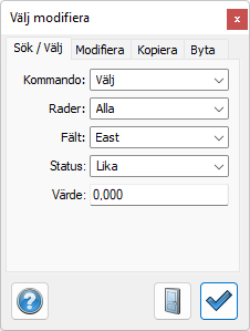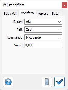 Under fliken Modifiera kan redigeringar göras i samband med sökningen, såsom Lägg in före, Lägg in efter, Ta bort text, Byt text, Omnumrera upp eller ner, Versaler, Gemena med mera. Detta är beroende på datatyp.