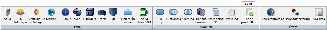 Solid Solid Ritning | Solid Solider Skapa Solid Solidlager, 3D horisontellt/lutande Vertikala solidlager Makron med solider 3D solid Svep Extrudera Rotera Lyft Linjer från solider Solid från DTM Modifiera Boolean, Slå ihop Boolean, Subtrahera Boolean, Skärning 3D Solid Boolean Avrundning 3D Avfasning Ange produktkod Övrigt Volymrapport Kollisionsdetektering BIM-data Copyright © 2025 by Adtollo AB.