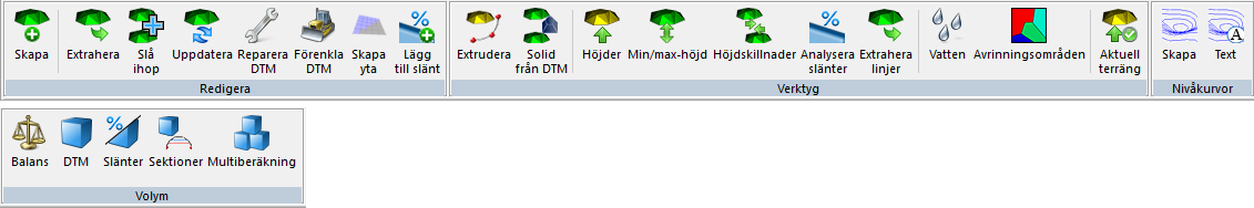 Terrängmenyn ser något olika ut beroende på vilken dokumenttyp som används. Skapa och redigera terrängmodell ingår i basmodulen men volymberäkningarna, som i sig är ett antal olika kommandon, ingår i modulen Volym modell. För vissa av dessa beräkningar behövs även modulerna Geometri respektive Volym sektion då resultatet skapar en sektionsfil (TCS).