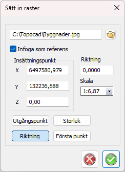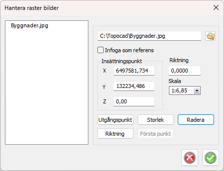I dialogen kan bildens position, orientering och skala anges. Datan kan antingen anges genom att skrivas in, eller genom att klicka i DTM-vyn. Om georefererad information finns tillgänglig för filen så kommer alla fält att vara ifyllda från början. Om Infoga som referens är ikryssad kommer endast filnamnet att sparas i DTM-filen, annars bakas rasterbilden in i DTM-dokumentet med följden att DTM-filen tar betydligt mycket mer utrymme.
