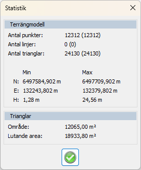 Kommandot statistik ger information om antal ingående objekt i terrängmodellen och dess min - och maxutbredning.