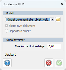Ange terrängmodellen. Markera sedan objekt, punkter, linjer som du vill ska tillföras till terrängmodellen. De inställningar som gällde för vald terrängmodell avseende max längd på triangelbens yttersida, hänsyn till H=0 och kontroll mot egna linjer gäller även i detta skede.