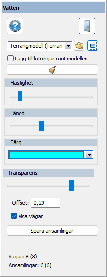 Funktion där man "häller" vatten på terrängmodellen för att se vart vattnet tar vägen. Det är möjligt att göra inställningar för hastighet, transparens, färg, tjocklek och om bara dropparna eller vattenvägarna ska synas. Hämta en terrängmodell och ange vart det ska "regna" genom att klicka på terrängmodellen. Funktionen finns i både ritningen och i terrängmodellen med den skillnaden att i ritningen är det möjligt att spara vattensamlingarna.
