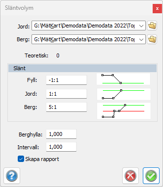 - Välj jordmodell och eventuell bergmodell i dialogen. Ange släntlutningar för fyllnad, jord och berg. Om en berghylla ska skapas ange då dess bredd, sätt annars värdet till 0. Om ingen bergmodell används behöver värdena för berghylla och lutning i berg ej anges. Interval anger noggrannheten i volymberäkningen. Lägre värde ger högre precision men tar längre tid. Volymen beräknas genom att dela upp området i ett rutnät där varje ruta är kvadratisk och med en bredd lika med intervallet. För varje ruta beräknas höjdskillnaden mellan teoretiska och terrängmodellerna. Dessa värden summeras och multipliceras med rutans area för att få fram totala volymen.
