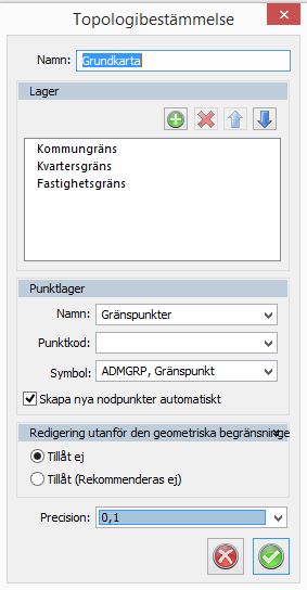 Här anger du valfritt namn för topologibestämmelsen. Du kan ha flera olika topologibestämmelser men enbart en åt gången som är aktiv. I databaskopplingar mot ISM och FDO kan du ange att karta använder en topologibestämmelse.