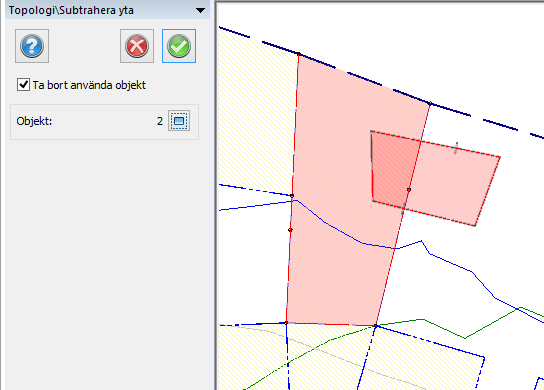 Kommandot subtraherar ytor från varandra. En polygon som har en annan polygon eller sluten linje som delvis delar av, eller finns inuti polygonen kan subtraheras med den eller de objekt som skär polygonen.
