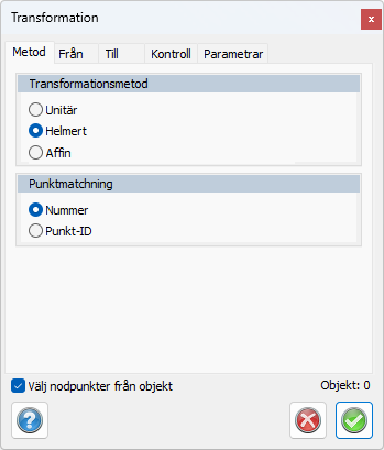 Du kan använda antingen Unitär, Helmert eller Affins beräkningsmetoder för transformationen och minst 3 punkter behöver användas för bestämning av parametrar. Du kan använda punkter antingen i den ordning du själv väljer eller utgå från Punkt-ID. Observera att det behöver vara samma ordning i Från- som i Till-system.