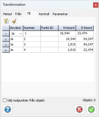 - Under Metod-fliken väljer du Transformationsmetod och Punktmatchning. Om du ska klicka ut punkterna i ritningen väljer du Nummer under Punktmatching. Då behöver du klicka ut punkterna under Till-fliken i samma ordning som du gjorde under Från-fliken. Om du har punkter med samma punkt-ID så behöver du inte klicka ut Från och Till-punkter i samma ordning, utan de kommer då matchas utifrån Punkt-ID. För att det ska gå behöver du ha Välj nodpunkter från objekt ibockat.