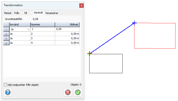 - Gå till Kontroll-fliken och se om det är något samband du inte vill använda, det krävs minst 3 samband för att se ett grundmedelfel, och få kontrollerbarhet på transformationen. Du ser en linje mellan från och tillpukten, samt en röd punkt som visar vart den transformerade från-punkten kommer hamna med hänsyn av samtliga samband som ingår i transformationen. Du kan välja att ta bort de samband som bidrar mest till ett högre grundmedelfel för en bättre transformation.