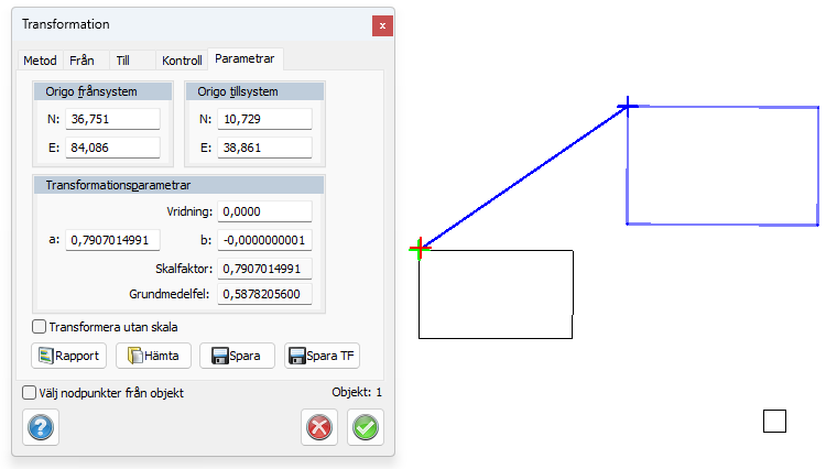 - Om allt ser bra ut gå till Parametrar-fliken. Här får du se resultatet av transformationsberäkningen. Du kan även välja om du ska transformera utan skala, om du vill skapa en rapport, eller spara transformationen så den kan återanvändas vid andra transformationer.