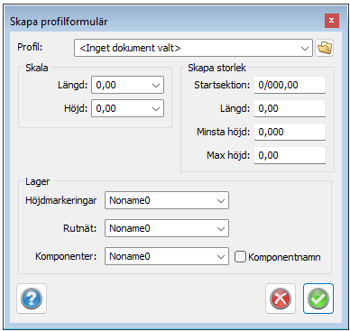 Skala och storlek väljs efter de inställningar som är satta i profilformuläret. Om du vill skriva ut en kortare del av formuläret ange den längd du vill ha. Efter att ha satt in den delen kommer programmet med automatik rulla fram startsektion till nästa beräknade startsektion och du kan sätta in denna del. Rubrikerna till vänster i formuläret kommer att repriseras med automatik.