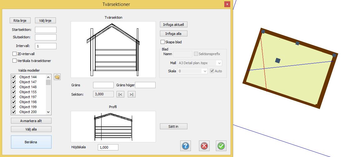 - Du kan välja att sätta in sektioner och/eller profilformulär i ritningen, alternativt att lägga in dem på på ett ritningsblad.