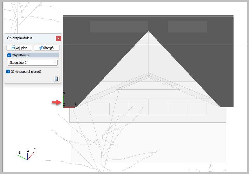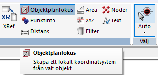 - 2D (snappa till planet), denna knapp gör att alla snappfunktioner ej tar C-koordinater från snappade objekt. Du kan alltså snappa mot alla punkter i ritningen men behålla C-koordinaten som 0. Med andra ord snappas allting till 2D-ytan som du valt med "Välj plan".