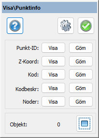 Det går även att ange att punktnoder ska visas för valda objekt, till skillnad från kommandot Ritning|Noder som visar samtliga noder. När du har valt att sätta in Punktinfo i ritningen görs inställningarna för dessa i Övrigt | Ritning | Inställningar.