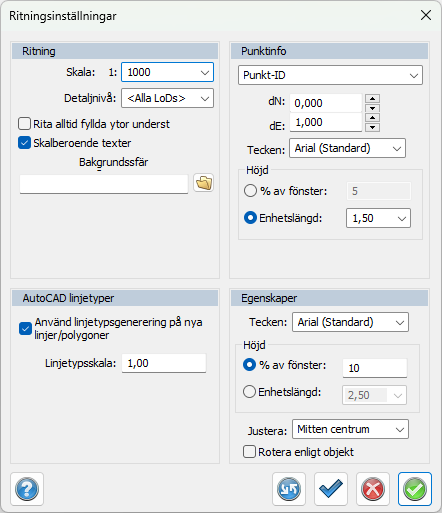 Visa Punktinformationen är ett snabbt sätt att se Punkt Id, höjder och koder på olika objekt i ritningen. Inställningarna för vilket teckensnitt, storlek och placering i förhållande till punkten görs genom att klicka på kugghjulet eller under Systeminställningar. Då kommer man till ritningsinställningar.