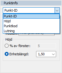 Klickar man på kugghjulet så kommer man till Ritningsinställningar där man under Punktinfo-menyn kommer åt inställningarna för Punkt-ID, Höjd, Punktkod och lutning. Man byter under rullistan.