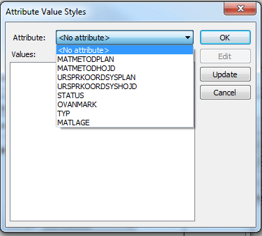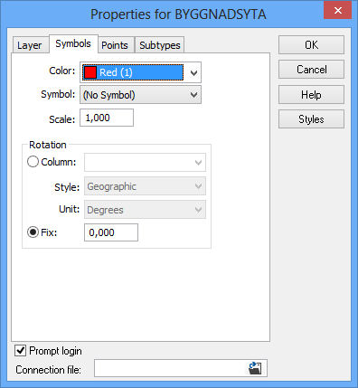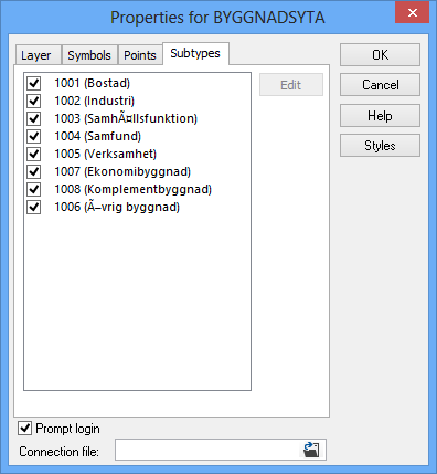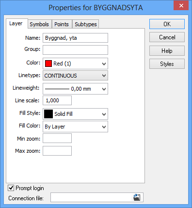This allows you to determine how every layer in the map, including sub-types, will be displayed in Topocad. Select the colour, line type and line scale for each layer. Symbols connected to the layer are selected from the symbol file. Sub-types can have their own settings.